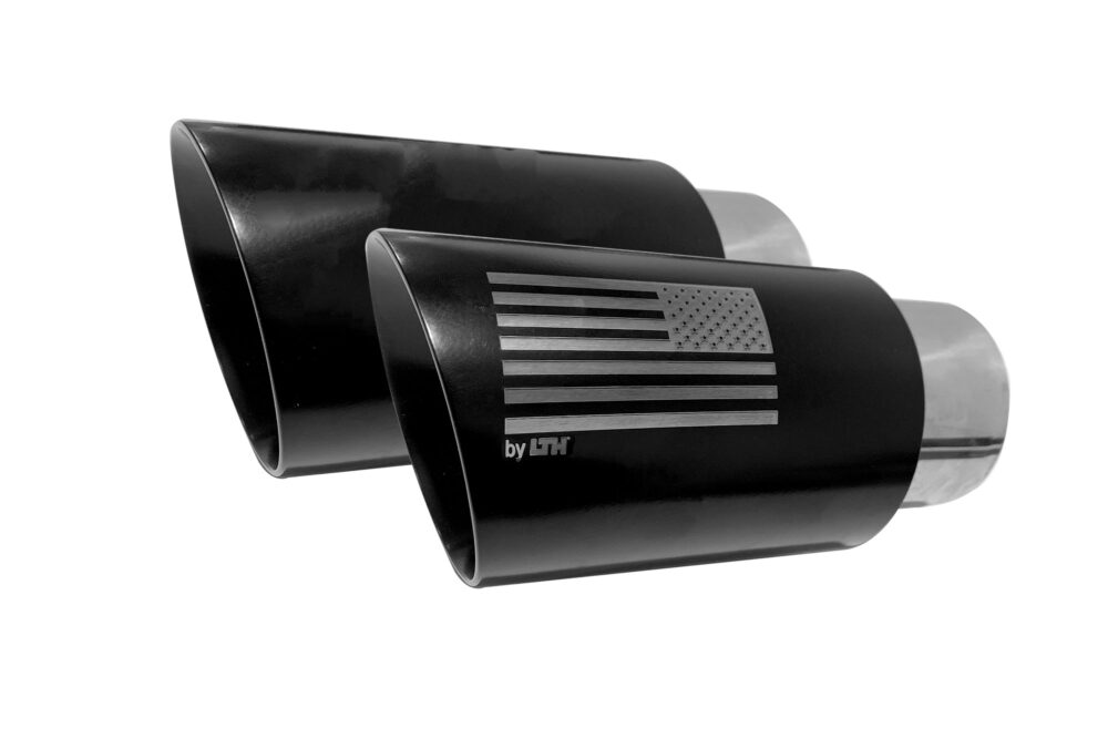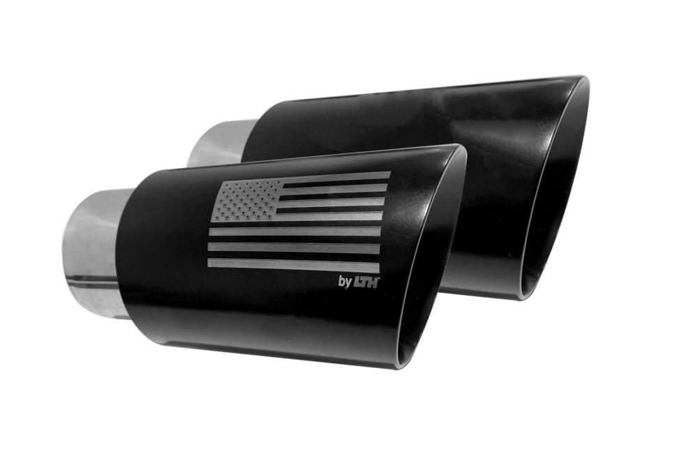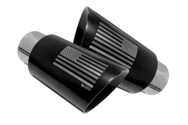American made 304 S.S. tips, Matte black tips with Laser engraving of the American Flag. Each tip is directional so the flag will be facing outward with the stars forward. This model fits the 05-17 single tip mufflers.